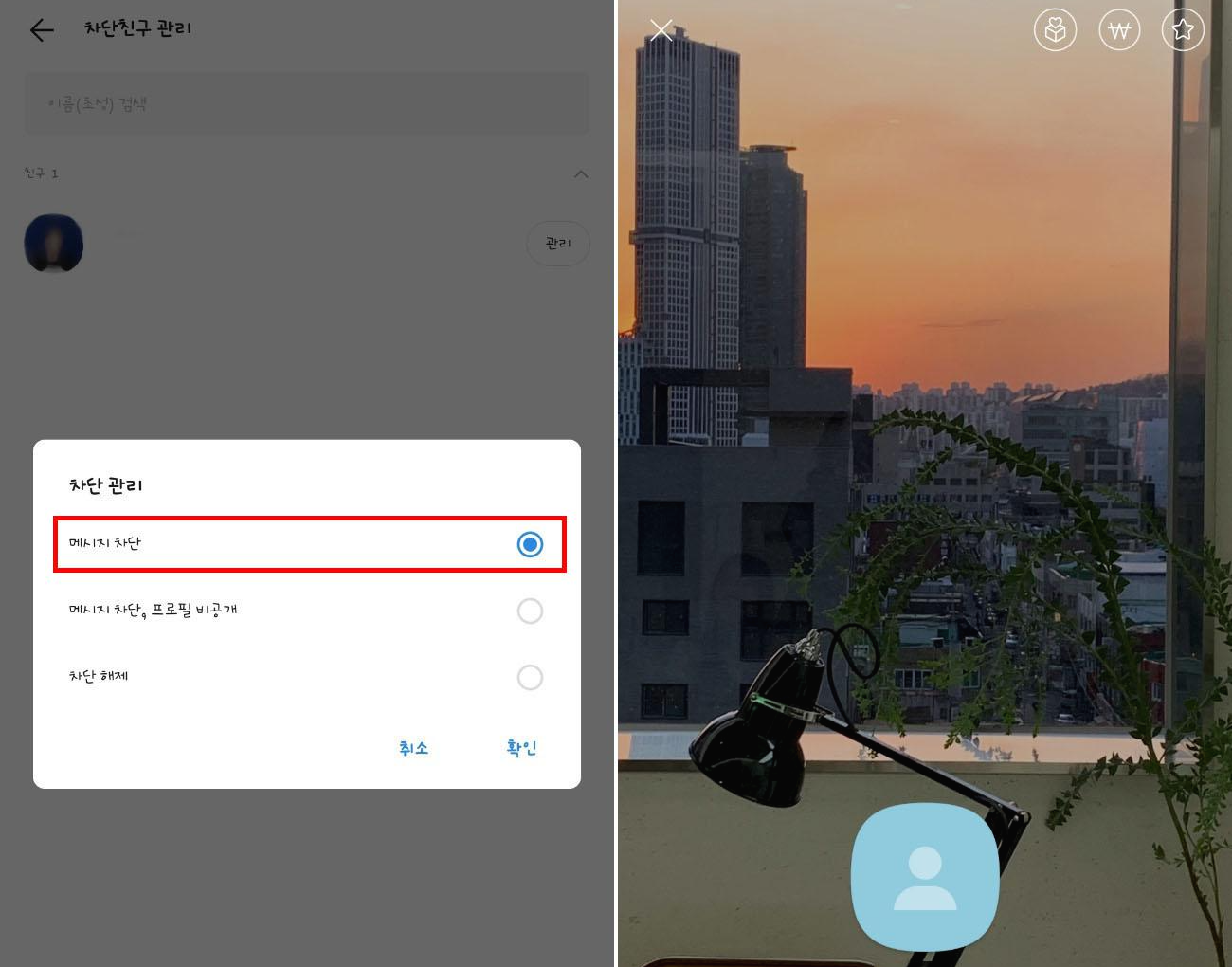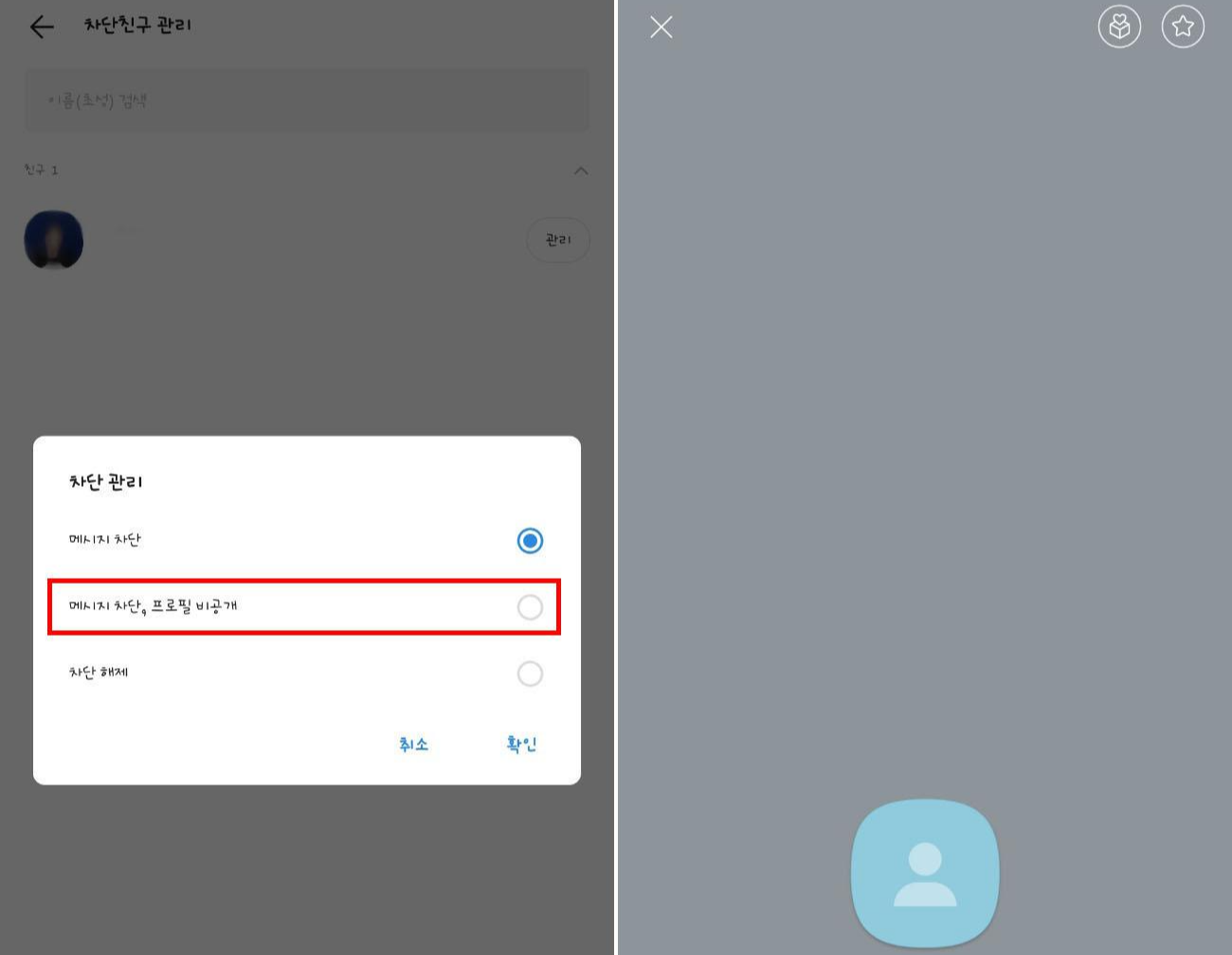 메시지차단,프로필 비공개는 메시지차단 및 프로필도 기본으로 돌아갑니다. 상대방 프로필은 기본설정으로 돌아가 아무것도 나오지 않게 됩니다.