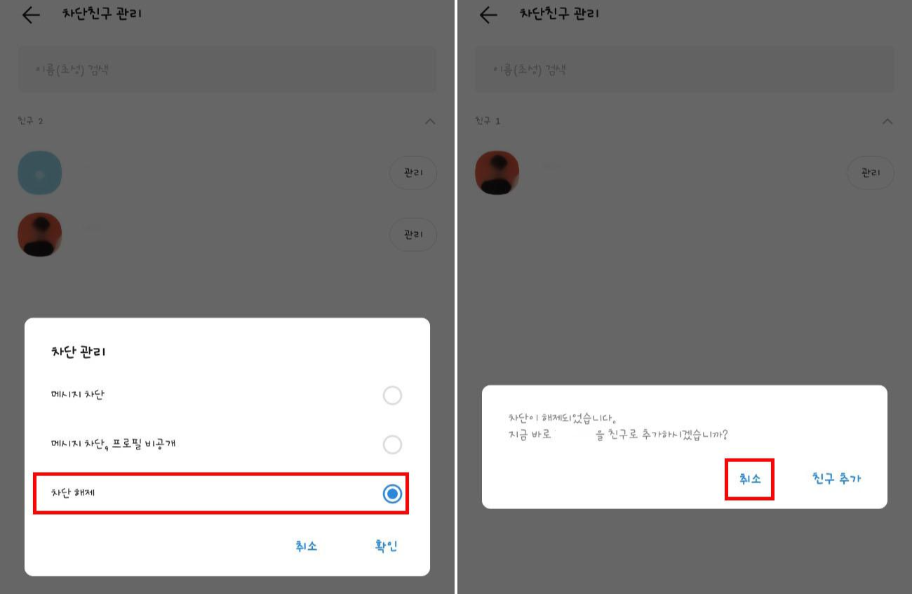 다시 해당 친구를 차단해제합니다. 여기서 중요한 점은 친구추가 여부를 물을 때 절대 친구추가 누르지 마시고 취소를 눌러주세요. 그래야 나중에 추천친구로 차단을 했는지 확인이 가능합니다.