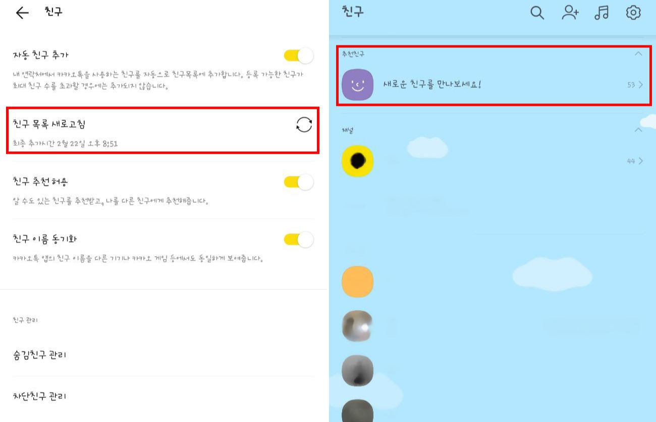 뒤로 가신 후 친구목록 새로고침을 합니다. 그리고 친구목록이 있는 곳에 가서 추천친구, 새로운 친구를 만나보세요! 에 들어갑니다.